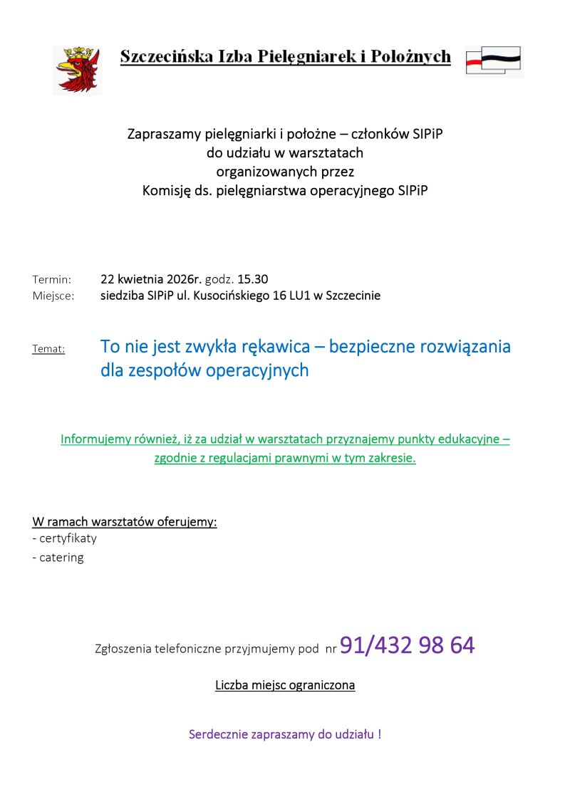 | Szczecińska Izba Pielęgniarek i Położnych uprzejmie informuje, że planujemy rozpoczęcie bezpłatnego kursu kwalifikacyjnego w dziedzinie „Pielęgniarstwa operacyjnego” dla pielęgniarek | czytaj |