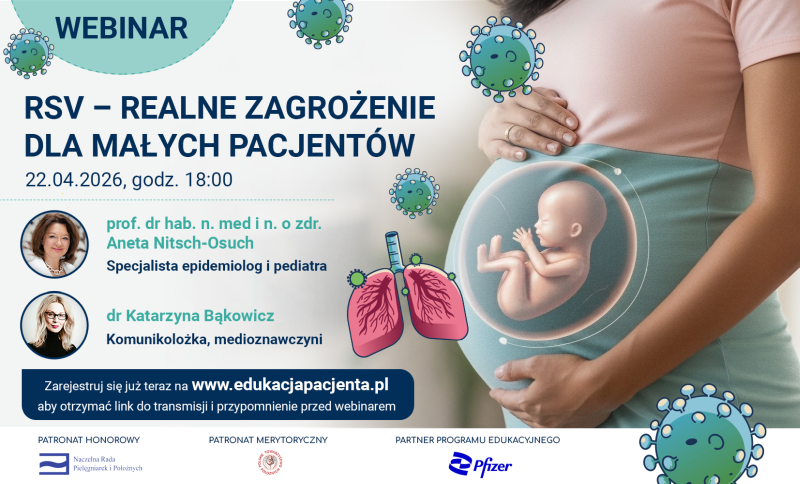 RSV – realne zagrożenie dla małych pacjentów. Patronat honorowy nad wydarzeniem objęła Naczelna Rada Pielęgniarek i Położnych, patronat merytoryczny Polskiego Towarzystwa Położnych. Webinar poprowadzą prof. dr hab. n. med. Aneta Nitsch-Osuch specjalista epidemiolog i pediatra oraz dr Katarzyna Bąkowicz Komunikolożka, medioznawczyni.