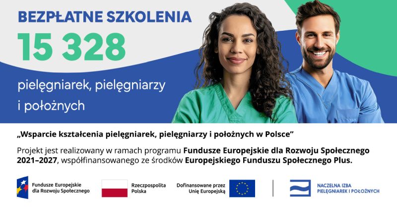 📚 Kursy realizowane są w ramach projektu „Wsparcie kształcenia pielęgniarek, pielęgniarzy i położnych w Polsce”, współfinansowanego ze środków Europejskiego Funduszu Społecznego Plus, w programie Fundusze Europejskie dla Rozwoju Społecznego 2021–2027.